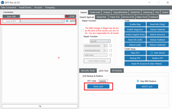 ثم نقوم باستعادة QCN الذي قمنا بعمل باك اب له مع ابقاء التحديد على Skip IMEI Restore كما في الصورة